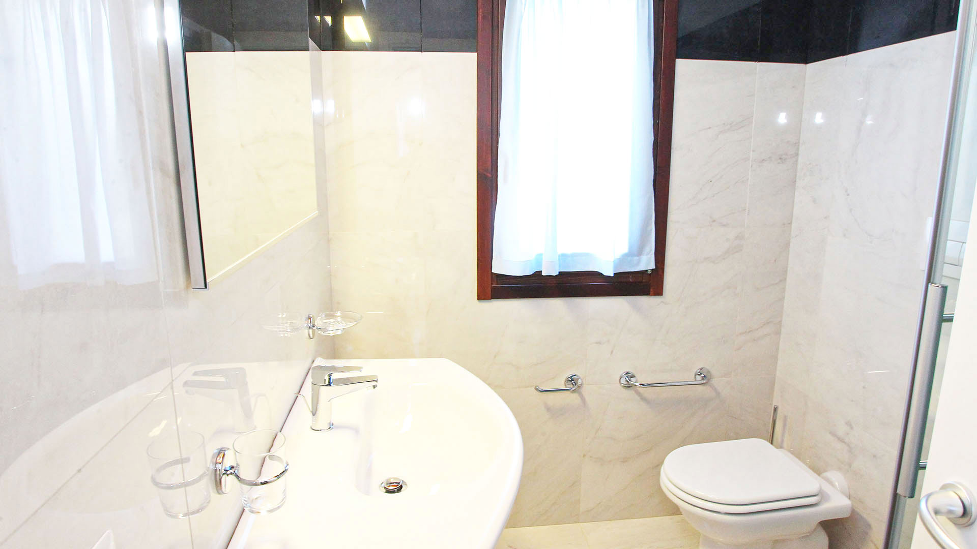 Grazie alle porte finestre, da cielo a terra, ogni ambiente dialoga armoniosamente con l’esterno, affacciandosi su veranda e giardino.