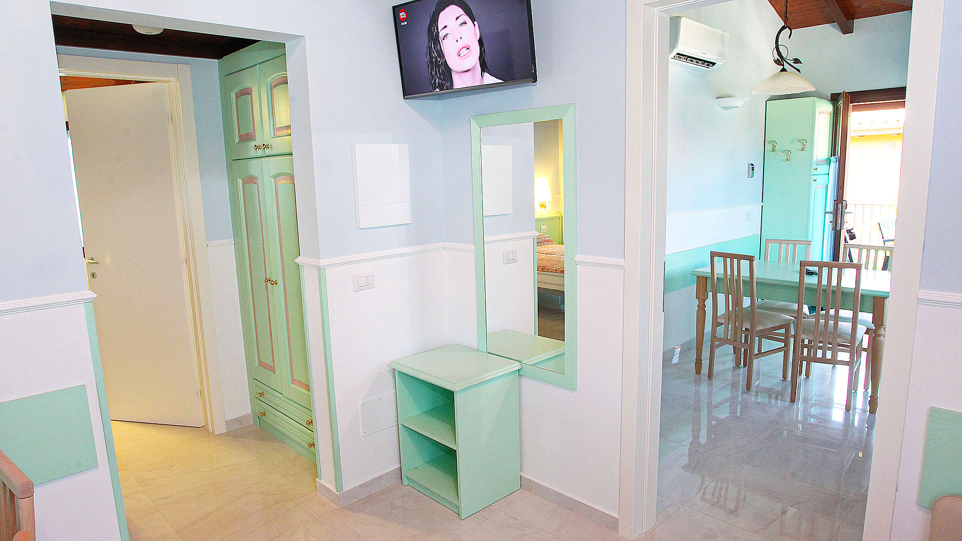 Gli arredi, su disegno esclusivo, esaltano la modernità delle linee, concedendosi nei tessuti un richiamo alla preziosità artigianale. I colori rendono omaggio alle infinite sfumature del mare e del cielo, e la bellezza di materiali, dal colore turchese al bianco tipico della pietra del Conero, confermano l’impostazione ecosostenibile del progetto.